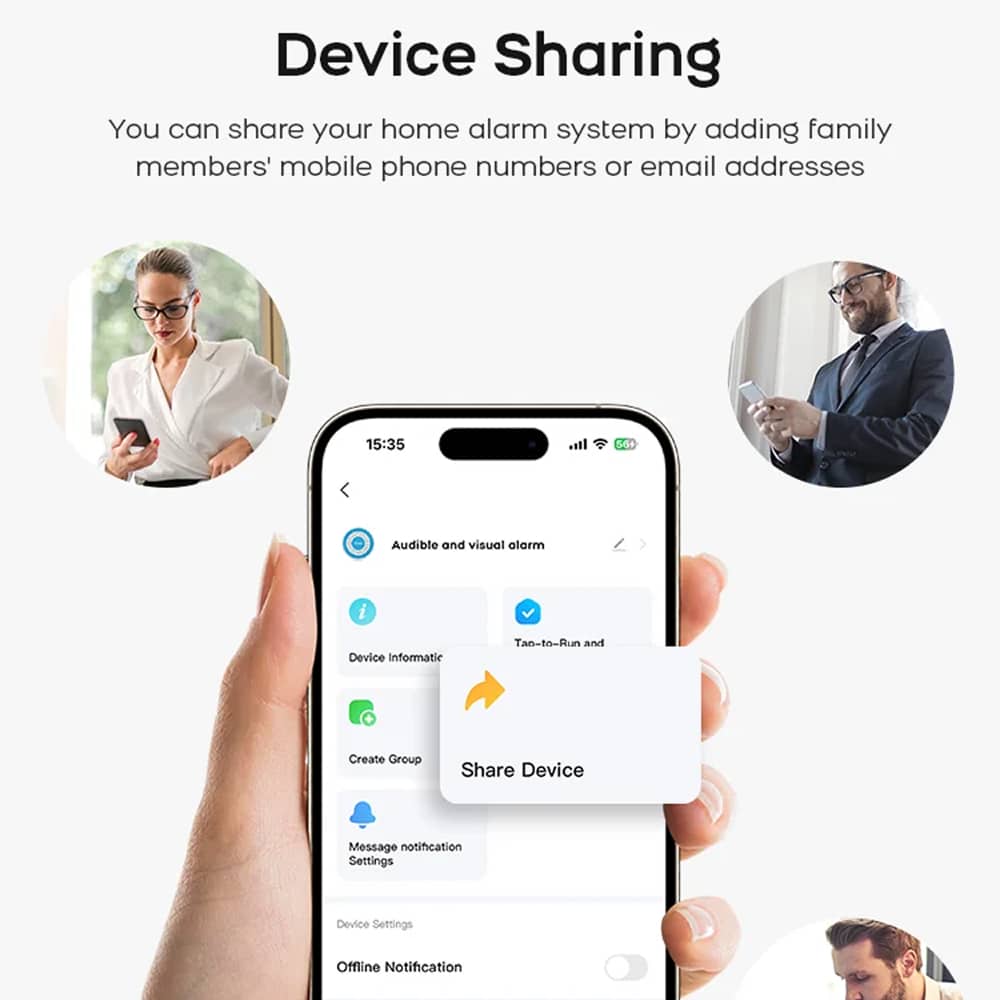 You can share access with unlimited family members by adding their mobile phone numbers or email addresses through the APP. Each member gets full control capabilities including arming, disarming, and receiving real-time security alerts.