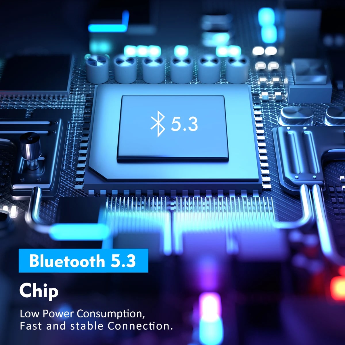 The Bluetooth 5.3 technology provides a stable connection range of approximately 33 feet (10 meters) in open spaces. Obstacles like walls may reduce range, but performance remains reliable during typical activities.