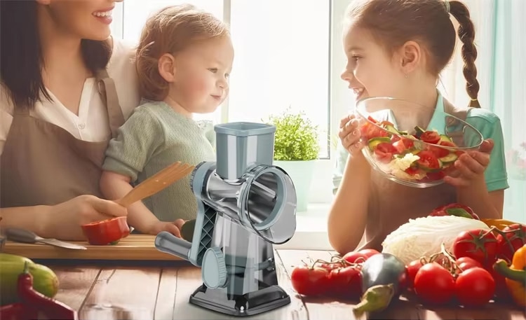 With its safety pusher and stable suction base, JiolipSis is safer than traditional graters. However, adult supervision is recommended for children, as the blades are sharp and the rotary mechanism requires proper handling.