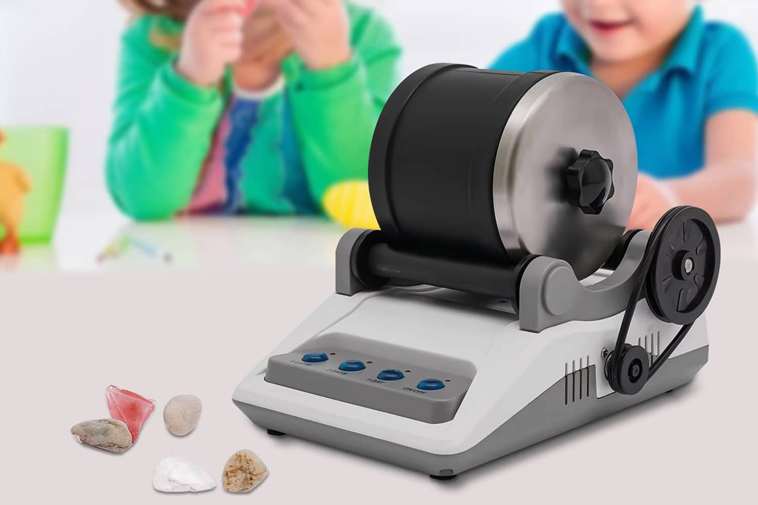 Yes, with adult supervision. The LustGemix is designed with safety features including a secure lid lock and low-voltage operation. It's an excellent educational tool for children interested in geology and rock collecting.