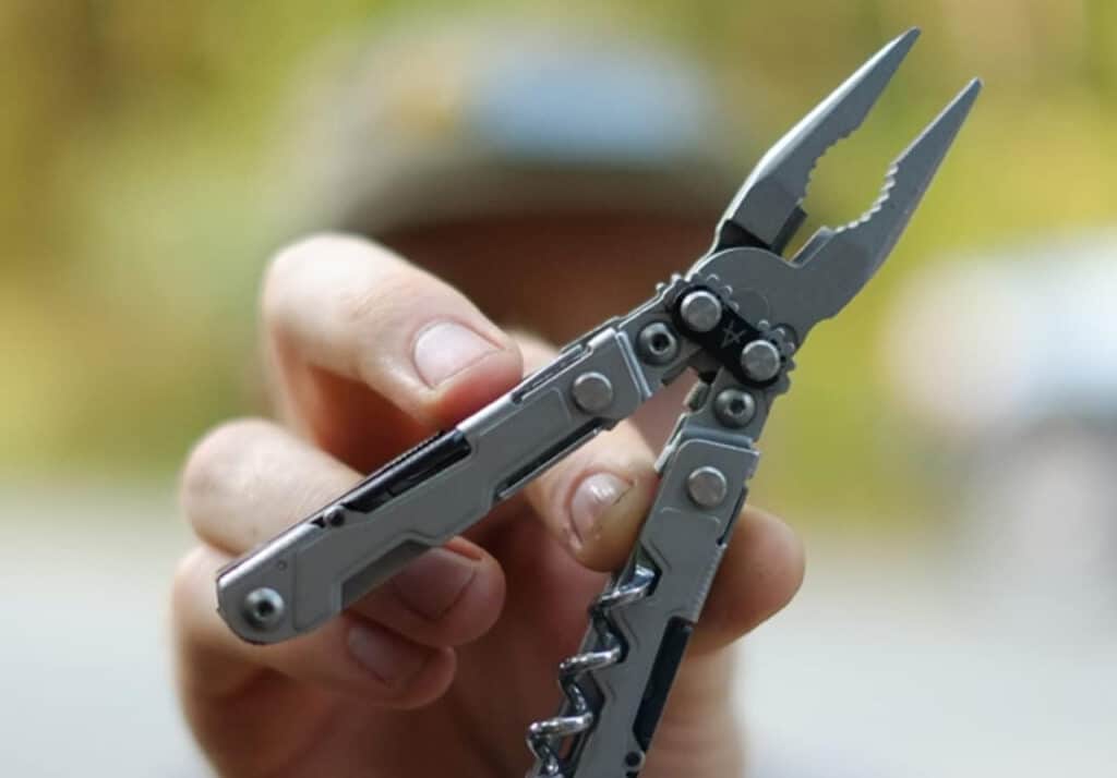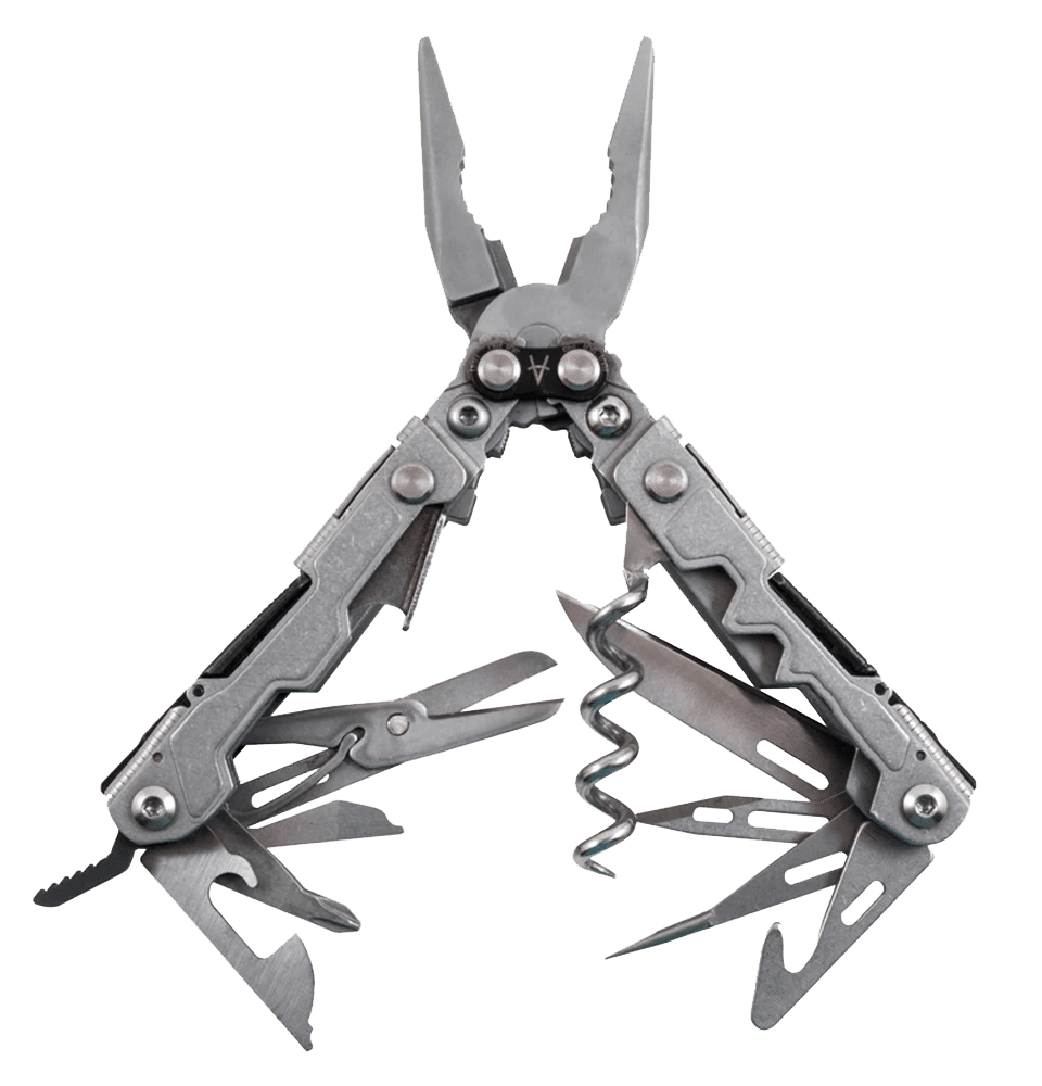OmniLix includes 18 functions: needle-nose pliers, regular pliers, wire cutters, knife blade, serrated blade, saw, file, bottle opener, can opener, multiple screwdrivers, and more essential tools.
