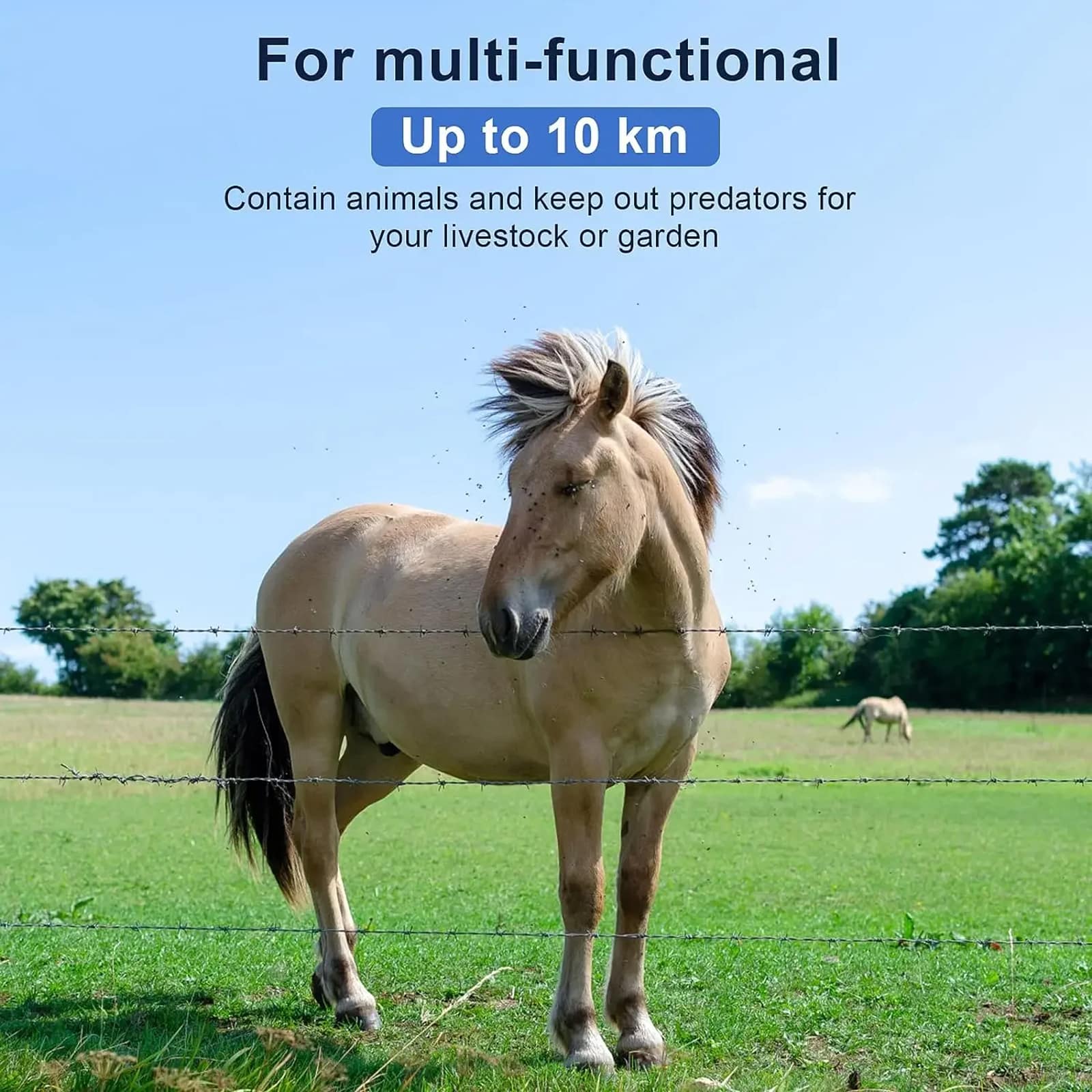 The SaveyFarm Electric Fence Energizer powers up to 10 kilometres of fencing, making it ideal for large farms and extensive agricultural properties requiring comprehensive livestock containment.