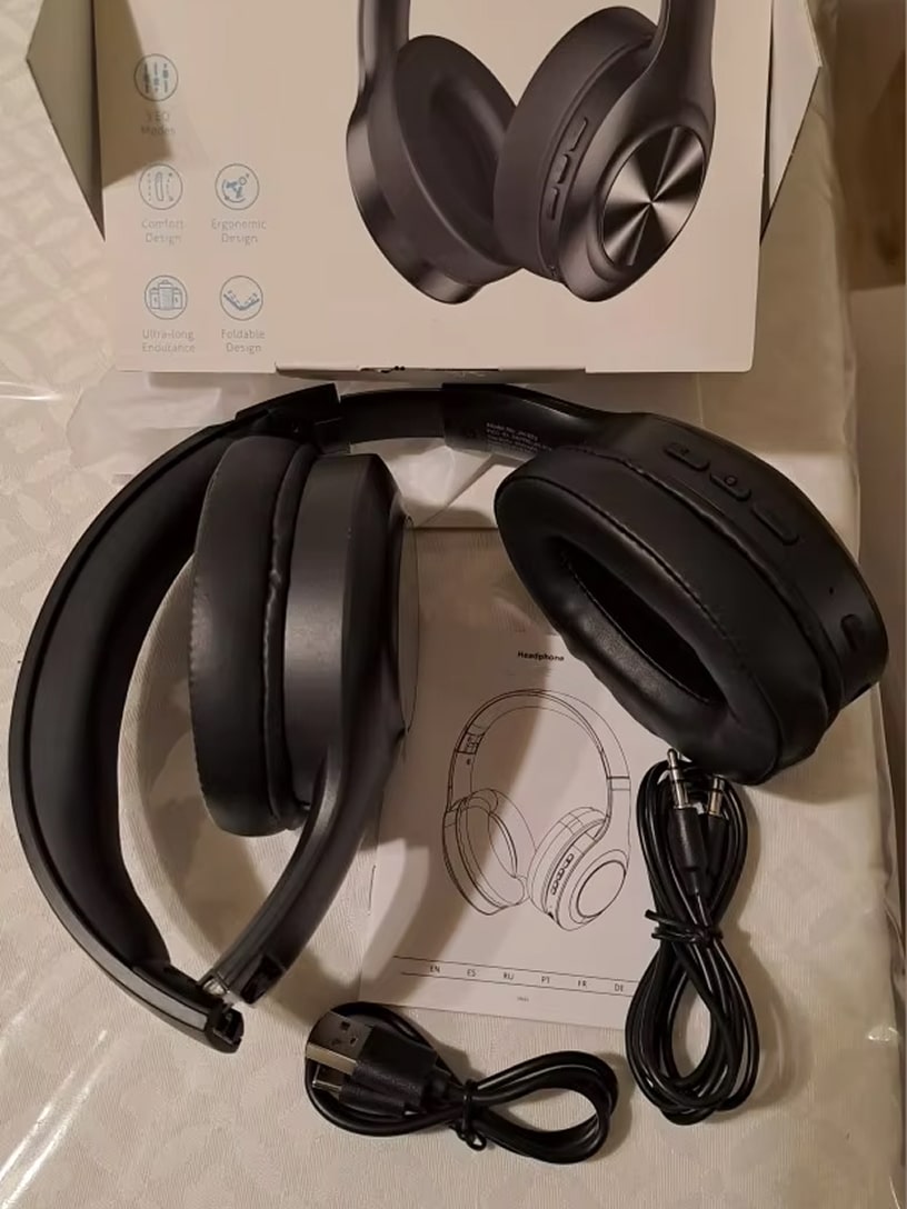 Each package includes SynxBeat headphones, a premium hard carrying case, USB-C charging cable, 3.5mm audio cable for wired listening, and a quick start guide.