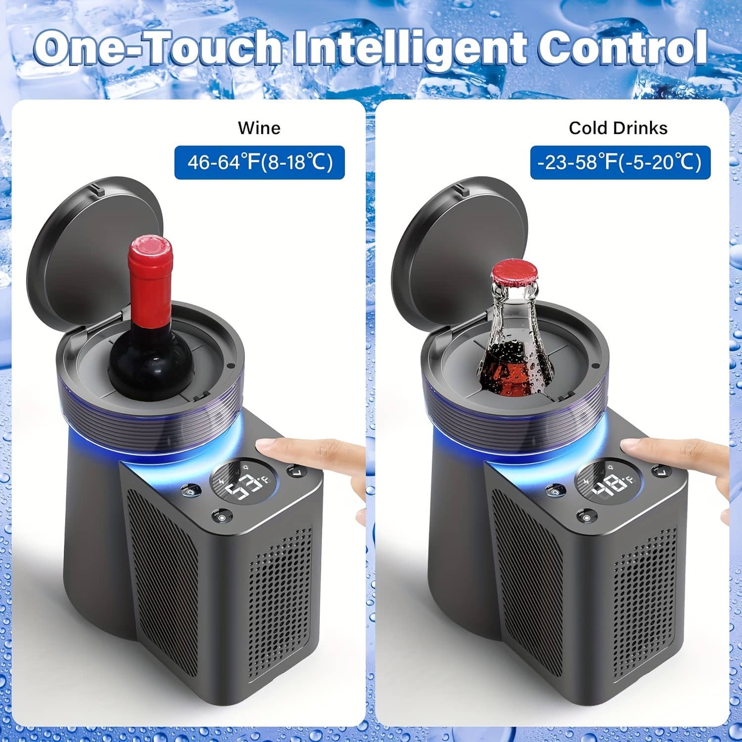 The one-touch system features preset modes for wine (46-64°F) and cold drinks (-23°F to 58°F). Simply select your preference, and the WineKoldy automatically adjusts to the optimal temperature.