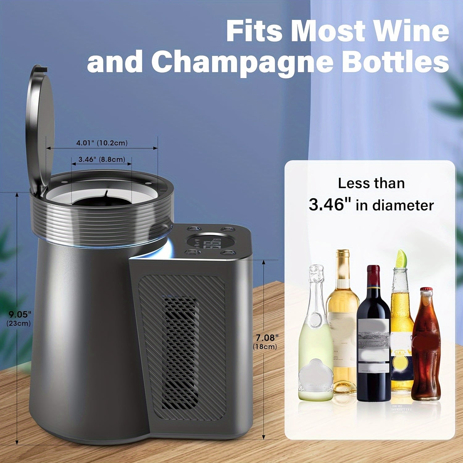 The WineKoldy fits most standard wine and champagne bottles up to 3.46 inches in diameter. Magnum bottles exceeding this diameter may not fit, but standard 750ml bottles work perfectly.